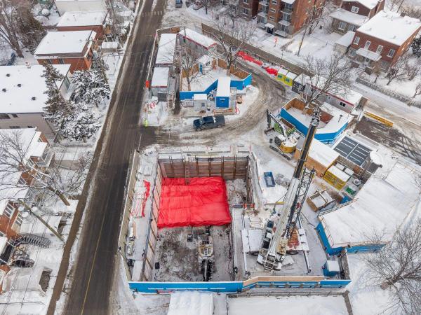Le sous-sol montréalais étant essentiellement constitué de roche calcaire très dure, les travaux d'excavation sont particulièrement ardus. Pour réduire les nuisances sonores des travaux, nous avons érigé des murs antibruit munis de laine acoustique autour de l’aire de chantier. Les premiers mois de cette phase seront cependant plus bruyants, puisque nous travaillons à une faible profondeur. Plus nous creuserons, moins les bruits du chantier seront perceptibles.