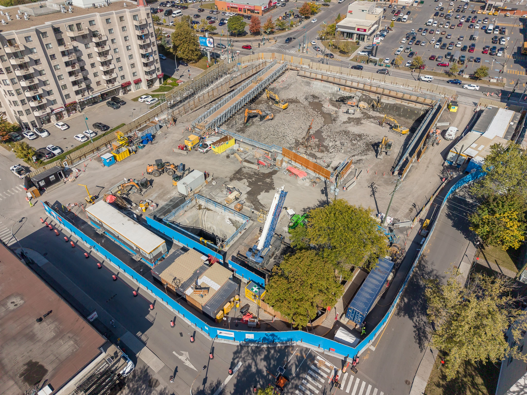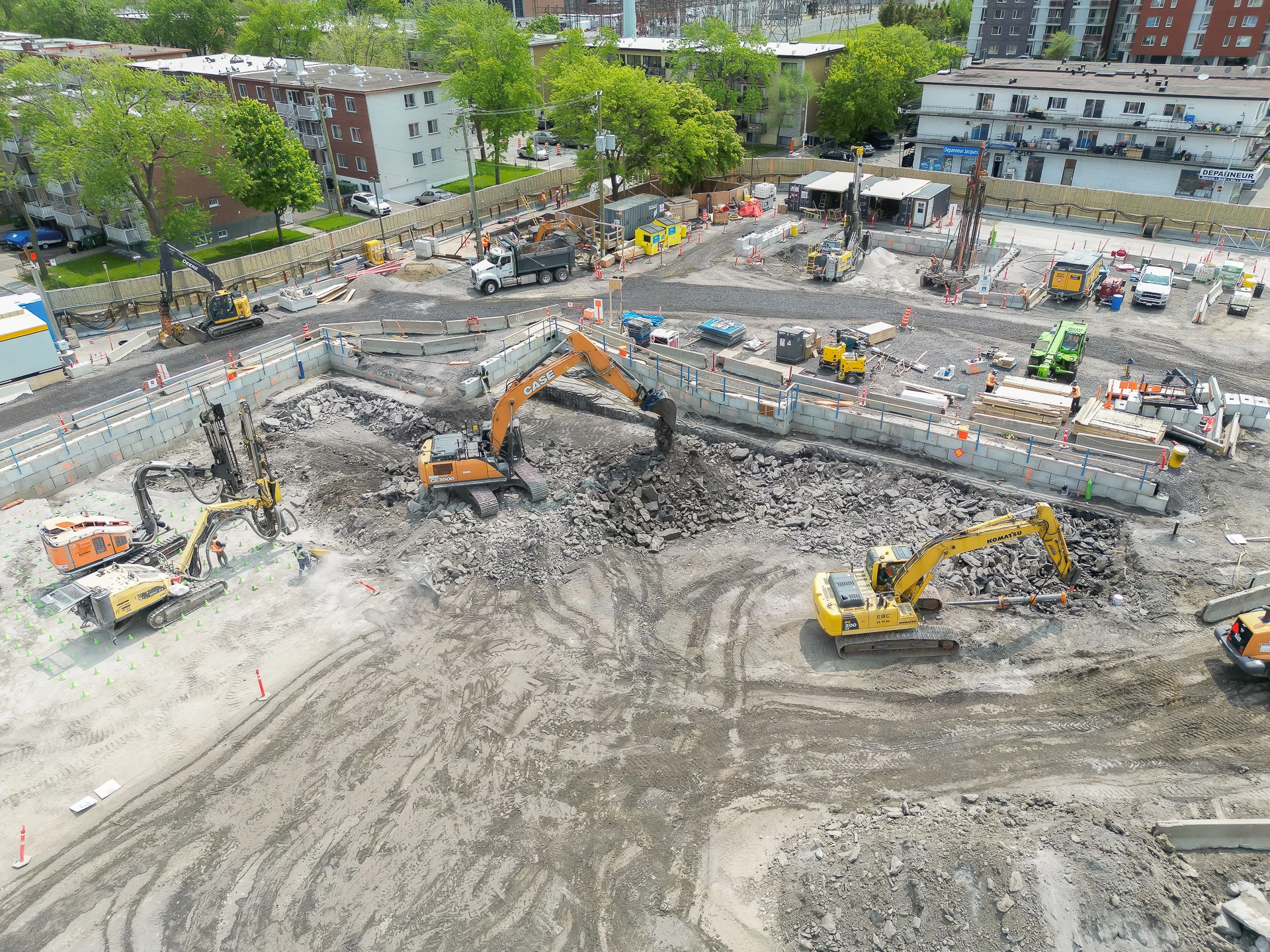 Le sous-sol montréalais étant essentiellement constitué de roche calcaire très dure, les travaux d'excavation sont particulièrement ardus et génèrent inévitablement du bruit. Alors que les opérations se déroulent actuellement en surface, un niveau sonore plus élevé est normal à cette étape. À mesure que les travaux progresseront en profondeur, les nuisances sonores diminueront graduellement.