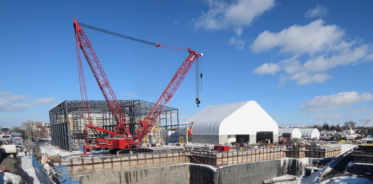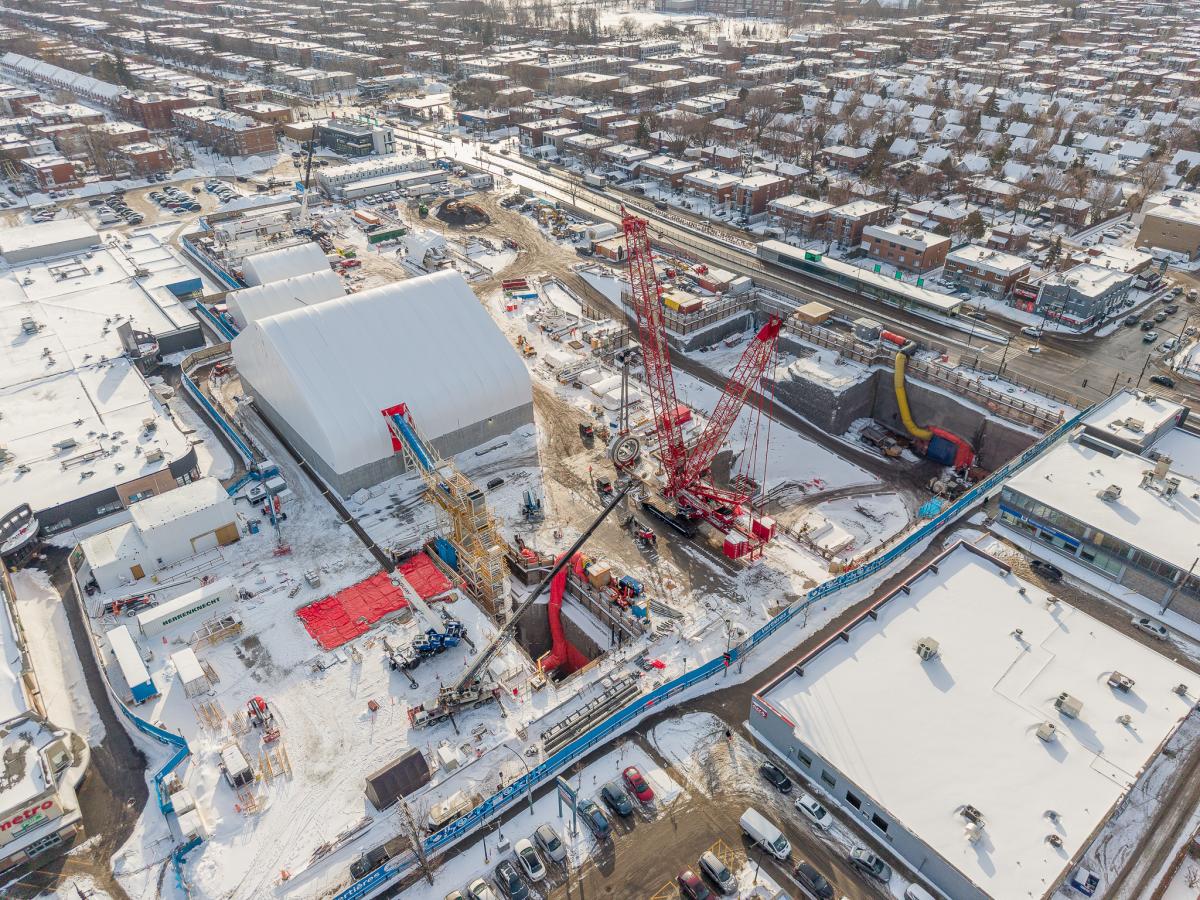 Après la mise en place d'un abri à déblais cet automne, une seconde structure d'envergure est en construction au chantier, en prévision de la mise en activation du tunnelier. Située au-dessus de l'excavation de la future sortie de secours de la station, elle servira principalement de zone d'entreposage afin d'alimenter le tunnelier avec le matériel nécessaire pour son avancée. En effet, celui-ci n'effectuera pas uniquement un travail d'excavation, mais installera aussi des anneaux en béton préfabriqués, qui formeront la voûte du tunnel.
