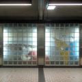 Like big picture windows opening out from the platform vault, four expanses of glass blocks reveal four large paintings. Counterclockwise from the departure platform, the works are by Charles Lemay, Marcelin Cardinal, Lauréat Marois (Habitacle), and Normand Moffat.