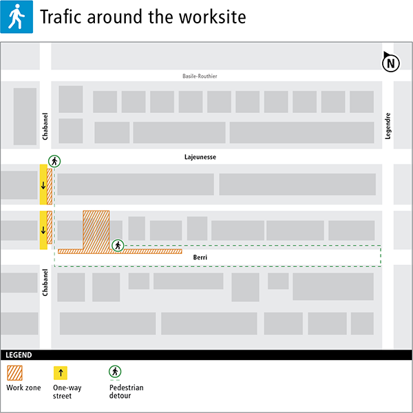 At the Berri and Chabanel intersection, a portion of the northeast sidewalk will be blocked during the work. Pedestrians can use the west sidewalk in this area.
