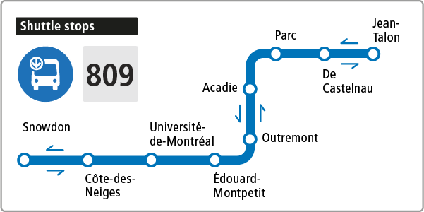 To serve customers during these exceptional closures, the STM will offer a shuttle service—the 809 shuttle—every 15 minutes from 5:30 a.m. to 7 a.m. and every 10 minutes from 7 a.m. to 7 p.m. It will run between Snowdon and Jean-Talon stations, which are both accessible. The shuttle will stop at each Blue line métro station and provide round-trip service.