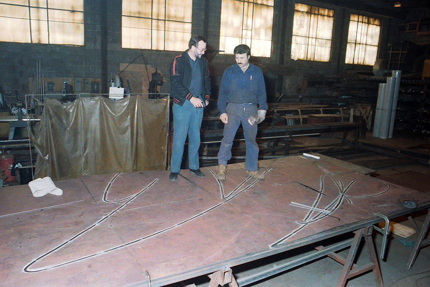 Réalisation de la sculpture L'arbre de vie par Joseph Rifesser (à droite, vers 1966)