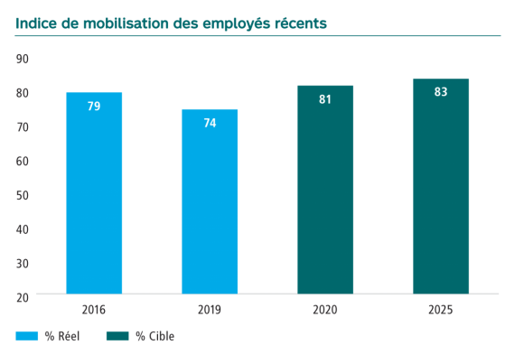 La STM évalue sa performance à attirer et retenir son personnel à partir de l’indice de mobilisation des employés à l’emploi de la STM depuis moins de deux ans. Cet indice se calcule à partir de réponses au sondage pluriannuel. En 2019, cet indice était de 74 %. Les résultats du sondage 2019 ont amené la STM à bonifier les pratiques internes, notamment celles d’accueil et d’intégration aux différents secteurs.