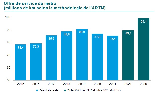 Malgré la baisse d’achalandage et les contraintes budgétaires, la STM a maintenu une offre de service répondant aux besoins de mobilité de la population. Des ajustements à l’intervalle entre les trains ont permis de maintenir la qualité du service tout en réduisant de 1,8 % les kilomètres offerts avec 85,4 millions de kilomètres en 2021 comparativement à 87,0 millions de kilomètres en 2020, sous la cible établie à 89,6 millions de kilomètres en 2021.(La méthodologie de cet indicateur a été ajustée, modifiant la valeur de 2015.) Cette offre de service de 2021 représente tout de même une bonification de 16,4 % des places-km depuis 2015.
