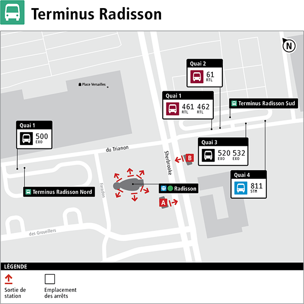 Le terminus Radisson Sud accueille les bus du RTL et d’exoainsi que les lignes 811 et 822 de la STM.