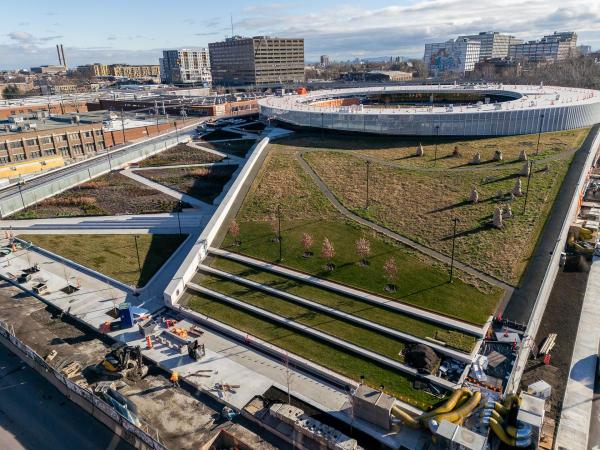 Deux bâtiments interreliés composeront le centre : un bâtiment souterrain où seront stationnés et entretenus les bus et le deuxième en forme d’anneau, composé de nombreuses fenêtres, où se trouveront les bureaux administratifs et des services requis pour les employés.