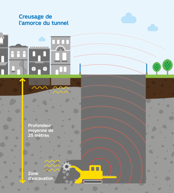 Durant cette phase, du bruit pourrait être perceptible en périphérie du chantier durant les premières semaines des travaux, le temps de percer l'embouchure du tunnel. Lorsque l'espace sera suffisant pour faire entrer l'équipement et que celui-ci progressera horizontalement, les sons et les vibrations associés aux travaux diminueront graduellement.